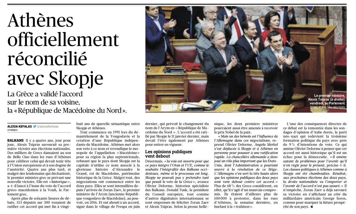 - Alexia Kéfalas (26 janvier 2019) rend compte, dans Le Figaro, de mon point de vue sur la ratification de l'accord de Prespa entre la Grèce et l'Ancienne République yougoslave de Macédoine.